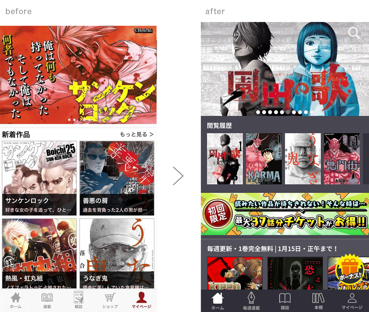 また白背景から黒背景に変更し、掲載作品のダークなイメージとマッチするトンマナを提案した。コンテンツ数もファーストビューで2コンテンツしか見えなかったため、4コンテンツに増やしプッシュしたい作品から順にユーザーの目に留まるように設定した。