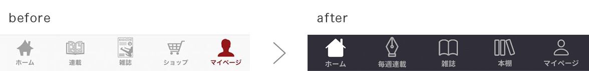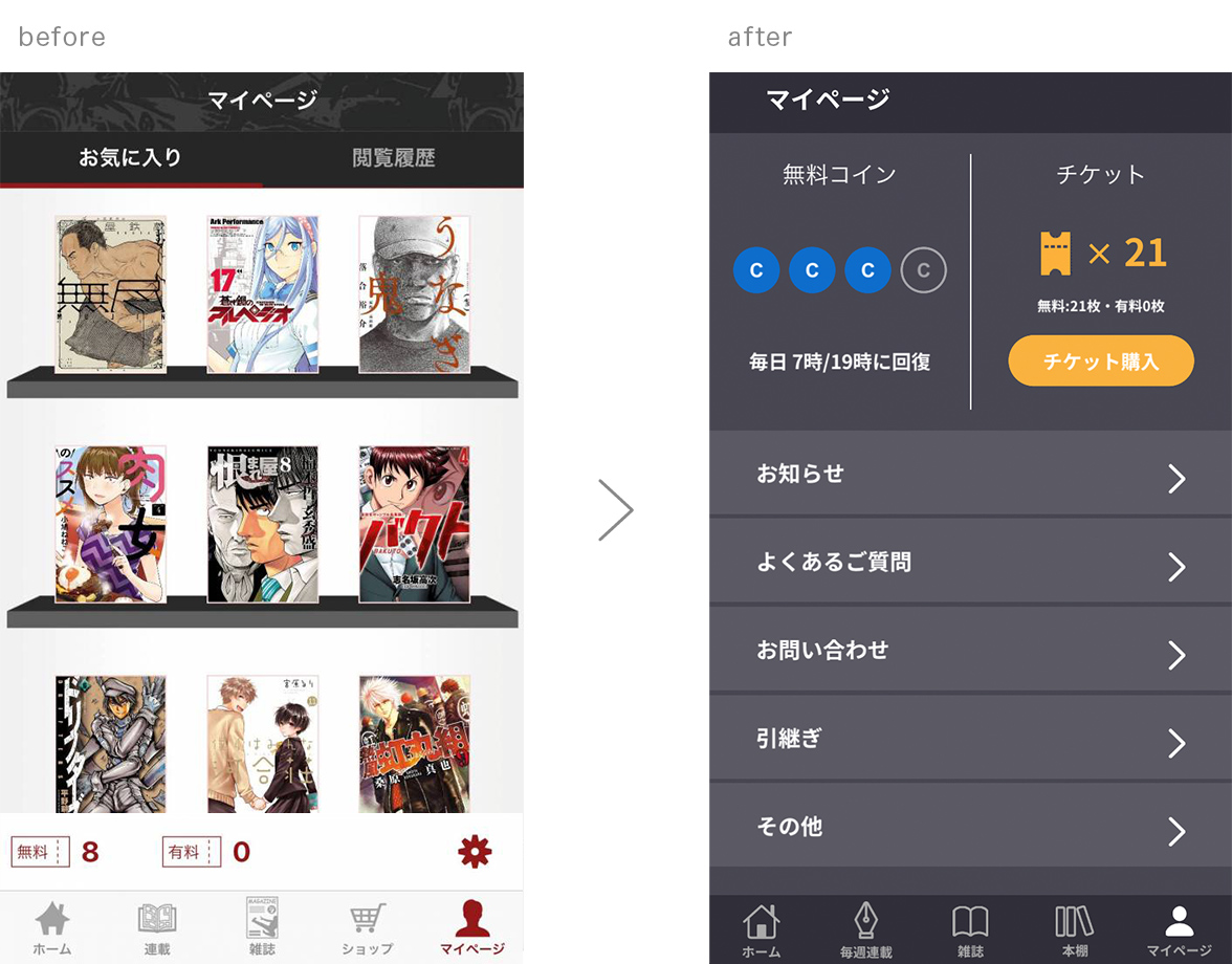 そこでマイページと本棚のカテゴリを切り分け、刷新した導線に合うような「赤:強調色・アクセントカラー、青:コイン、黄色系統:チケット」といったカラールールを設定した。